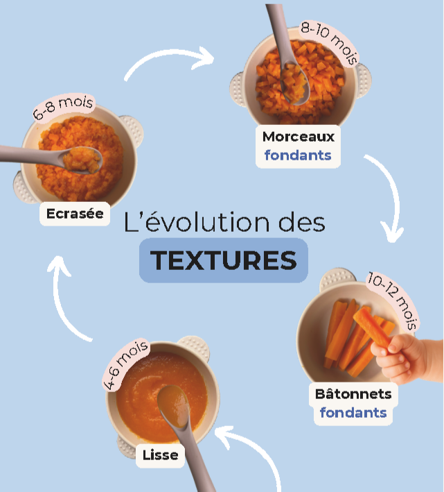 - Varier les textures dès 6–8 mois est une étape indispensable pour la mastication