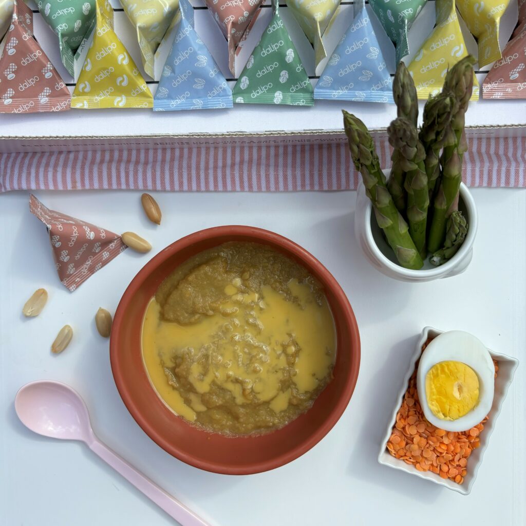 Éveillez les papilles de votre bébé en douceur avec cette purée fondante de lentilles corail, asperges, oeuf dur et arachide. Une recette salée pleine de saveur pour introduire nos berlingots Dalipo Arachide dès les premières étapes de la diversification ! 👶✨