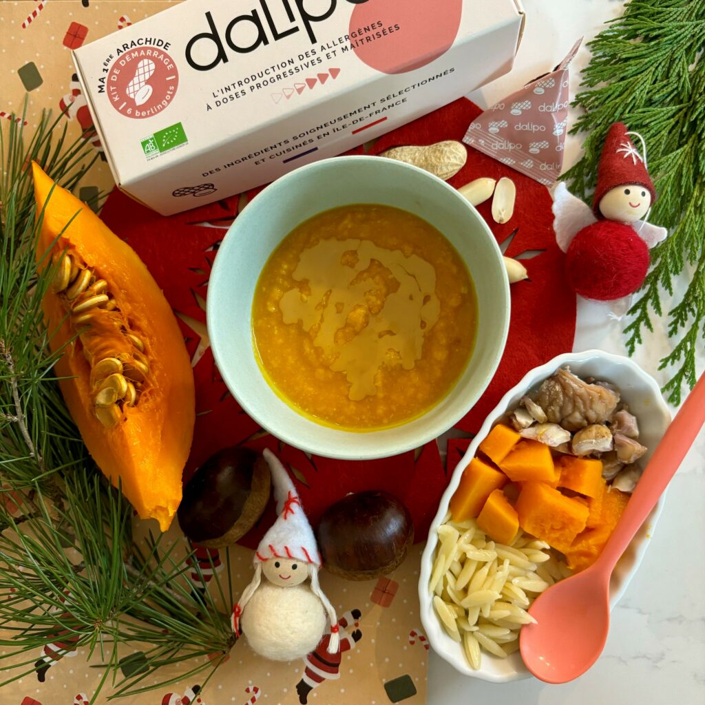 Faites voyager les papilles de votre bébé avec une association toute douce : purée de potimarron, orzo, marrons à la cacahuète ! Une recette super facile pour introduire nos berlingots Dalipo Arachide dès le début de la diversification.